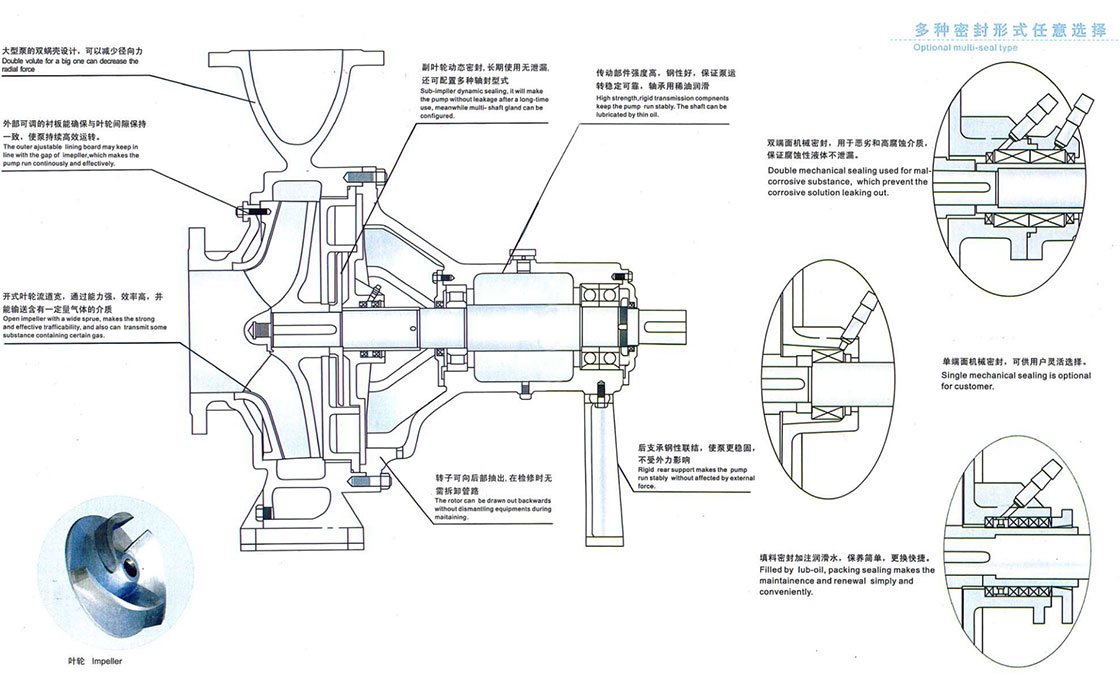 軸封(fēng)型式包括:副葉輪動態密封(Y)、單端麵機械密封(S)、雙端麵機械密封(fēng)(D)、填料密(mì)封(P)。